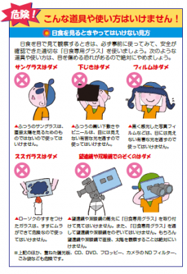 何をしてはいけないか、もう一度確認5月21日の金環日食まで、と10日あまりとなった。もう一度、正しい観測方法をおさらいしておこう。金環日食では、何をしてはいけないかをきちんと知っておくことが大切だ。