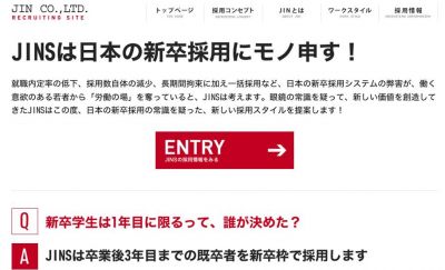 新しい採用スタイル若者に人気の眼鏡チェーン店「JINS(ジンズ)」を展開する株式会社ジェイアイエヌは、学校卒業後3年以内ならば何度でも新卒採用枠に応募できる「再チャレンジ制度」を2011年春に導入することを発表した。