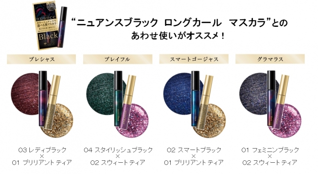 そしてこのグロスマスカラは、ブラックをベースにレッドやネイビー、グリーンなどのニュアンスを織り交ぜた『ニュアンスブラック ロングカールマスカラ』(税抜き1800円)と相性抜群。